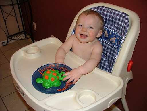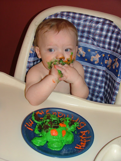 Sam started grabbing the plate from me before we could even really get a picture of just him and the cake without his fingers in it. It was cute. He just sat there with his finger in it for a minute or so as if he was really enjoying the feel of it.
