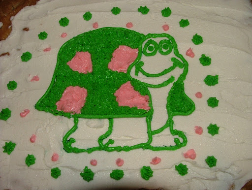 So I began searching for a cute turtle cake. I did lots of research online as well as in stores. All I came up with was a few ideas and no skills to go on. You'd think I'd just abandon the idea then, but no, bought all kinds of stuff to try copying a cute turtle I'd found onto a cake. Before doing it right on a birthday cake, I decided to try it on something else first, so I whipped up a quick giant chocolate chip cookie and frosted part of it white, then drew this turtle on with icing.