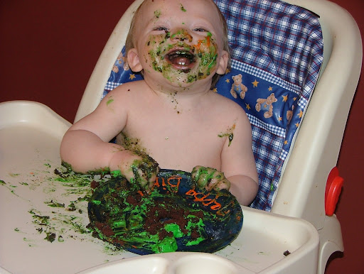"Green--YUM!" Gotta love the hunk of cake on the forehead.