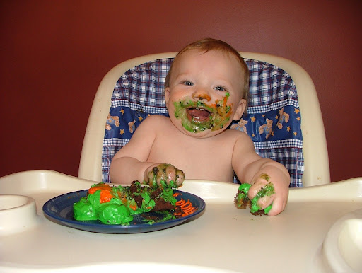 "Green--YUM!" Gotta love the hunk of cake on the forehead.