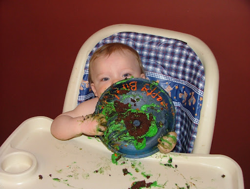 "Look, I ate the whole thing!" I really didn't clean up all that much cake, which means I think he really ate a lot of it.